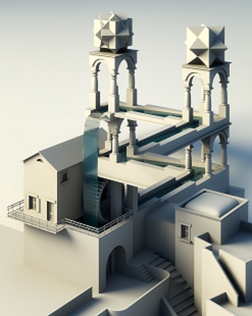 The inspiration for this art draws largely from the twentieth century Dutch artist, M.C. Escher, whose art was itself mathematically inspired to an extent. The first two pictures below are actual re-workings of Escher's 'Relativity' and 'Waterfall'.