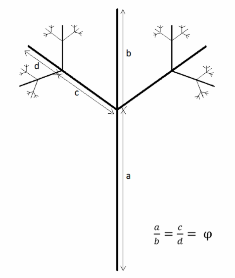 I have included a design of my own theoretical branching fractals below to show you some more of this golden ratio self-similarity at work, albeit theoretical in the context of my illustration. Hopefully this will give you a feel for how this property of golden-ratio-proportionality scaling relates to trees in the real world.