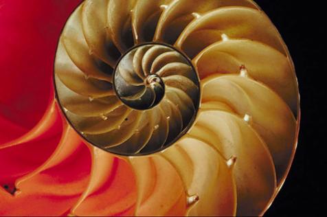 The naturally realised equivalent to the golden ratio's infinitely continued fraction effect is nicely demonstrated in the logarithmic spirals of a nautilus mollusk as shown in the picture below. These spirals extend outwards in proportions very close to that of j. This is more than just coincidence. Nature - specifically the process of natural selection - unconsciously but very much non-randomly, converges upon this number as a way of optimising the growth of various organisms which have the same dilemmas as all living organisms, namely, how to optimise growth when constrained by limited space and resources.