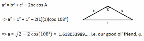 Using the cosine rule, we can prove that the diagonals of any regular pentagon with sides of length 1 are just j in length (as depicted in the diagram above). Assuming the angles shown are already self-evident to readers familiar with theorems which describe angles within n-sided regular polygons as well as angles within isosceles triangles, then rearrangement of the 'cosine rule' formula to determine the base length of the uppermost triangle in our pentagon will yield a way to determine the length of these pentagonal diagonals as follows: