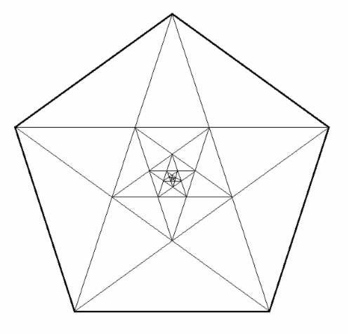 Finally, I couldn't resist the opportunity to show you how the pentagon and pentagram can be merged together to create a recursive fractal design which appears the same at all scales regardless of how far you zoom in or out of the centre of this image. To those interested, I was able to construct this fractal pattern in a very straightforward manner using tools within 'Paint'. The special properties of our special little number make it possible to perfectly inscribe a pentagram within a pentagon within a pentagram within a pentagon within a pentagram within a pentagon, and so on, ad infinitum. Who said you can't have fun with straight lines?