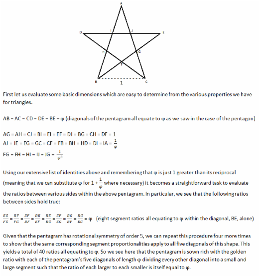 The repeated occurrence of the golden ratio in the pentagon - and in particular its derivative, the five-pointed star or pentagram - is largely why these figures became symbols of worship for the Pythagoreans. So enchanted were they by this number, j, they took it to be a divinely sanctioned proportion.