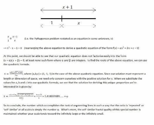 For the sake of simplicity, I have arbitrarily assigned the value 1 to the shorter segment and shown you below how this problem translates algebraically to solving a quadratic equation whose solution yields the golden ratio, j. Incidentally, the fact that we can solve a quadratic polynomial for j explicitly in this way is the reason why j does not qualify as 'transcendental'.